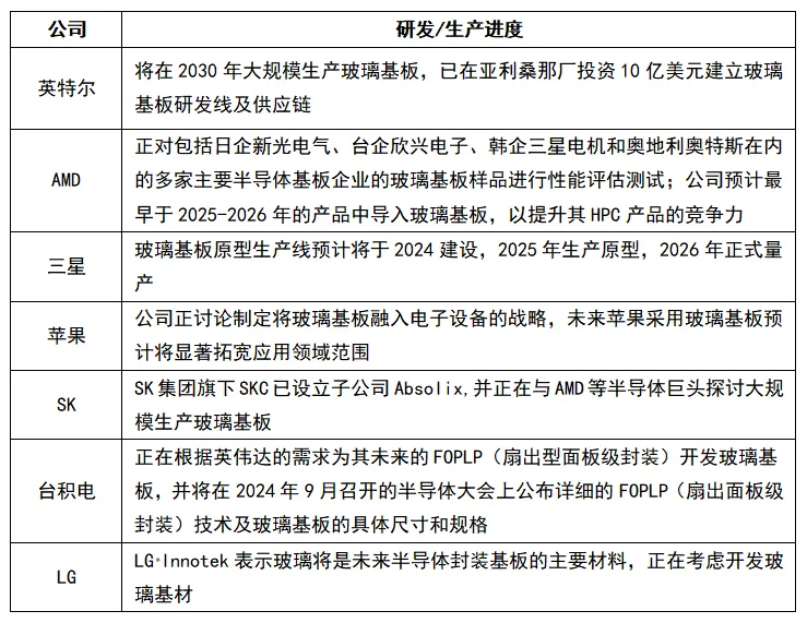 國(guó)際方面,全球玻璃基板格局相對(duì)集中,較多玻璃基板產(chǎn)品和技術(shù)由少數(shù)國(guó)外廠商掌握。根據(jù)News Channel Nebraska Central 2022年數(shù)據(jù)顯示,美國(guó)康寧(Corning)、德國(guó)樂(lè)普科LPKF、美國(guó)申泰(Samtec)、Kiso Micro、日本泰庫(kù)尼思科(Tecnisco)等全球前五名廠商占據(jù)全球TGV晶圓市場(chǎng)份額的70%以上。此外,在芯片封裝領(lǐng)域,玻璃基板因其卓越的性能和潛在的應(yīng)用前景,吸引了包括英特爾、三星、AMD在內(nèi)的多家科技巨頭的關(guān)注。英特爾已投資超過(guò)10億美元在亞利桑那州錢(qián)德勒的超潔凈CH8工廠生產(chǎn)玻璃基板,旨在發(fā)揮TGV的技術(shù)特點(diǎn)為服務(wù)器和數(shù)據(jù)中心中的大算力芯片帶來(lái)速度和功耗優(yōu)勢(shì);2023年,英特爾最早宣布推出基于下一代先進(jìn)封裝的玻璃基板開(kāi)發(fā)的最先進(jìn)處理器,并計(jì)劃于2026-2030年量產(chǎn)。2024年初,三星提出將建立一條玻璃基板原型生產(chǎn)線,計(jì)劃于2026年實(shí)現(xiàn)量產(chǎn)。AMD預(yù)計(jì)最早于2025-2026年在產(chǎn)品中導(dǎo)入玻璃基板,以提升其HPC產(chǎn)品競(jìng)爭(zhēng)力。
