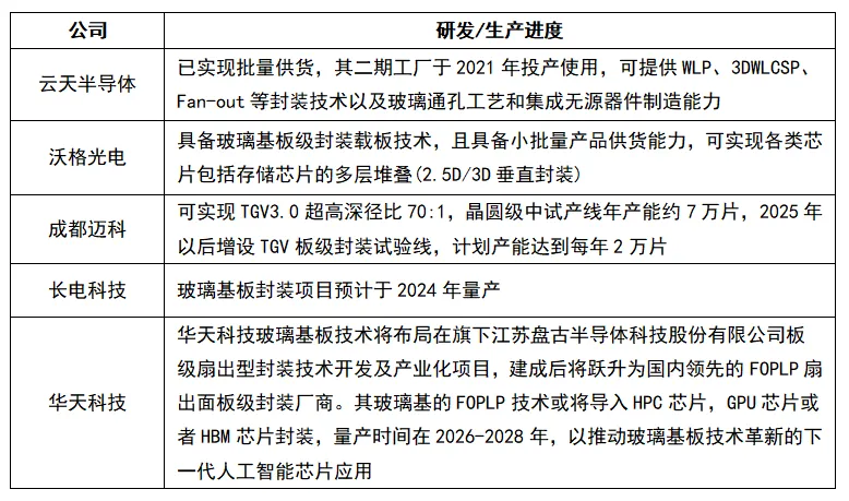 國(guó)內(nèi)方面,以云天半導(dǎo)體、沃格光電、成都邁科等為代表的國(guó)內(nèi)廠商有望打破海外廠商高度壟斷的TGV市場(chǎng)競(jìng)爭(zhēng)格局。云天半導(dǎo)體已實(shí)現(xiàn)批量供貨,其二期工廠于2021年投產(chǎn)使用,可提供WLP、3DWLCSP、Fan-out等封裝技術(shù)以及玻璃通孔工藝和集成無(wú)源器件制造能力。沃格光電掌握玻璃基板級(jí)封裝載板技術(shù),且具備小批量產(chǎn)品供貨能力,其玻璃基板級(jí)封裝載板產(chǎn)品采用TGV技術(shù),可實(shí)現(xiàn)2.5D、3D垂直封裝。成都邁科可實(shí)現(xiàn)TGV3.0超高深徑比70:1,晶圓級(jí)中試產(chǎn)線年產(chǎn)能約7萬(wàn)片,2025年以后增設(shè)TGV板級(jí)封裝試驗(yàn)線,計(jì)劃產(chǎn)能達(dá)到每年2萬(wàn)片。此外,長(zhǎng)電科技已在進(jìn)行玻璃基板封裝項(xiàng)目的開(kāi)發(fā),預(yù)計(jì)2024年實(shí)現(xiàn)量產(chǎn)。
