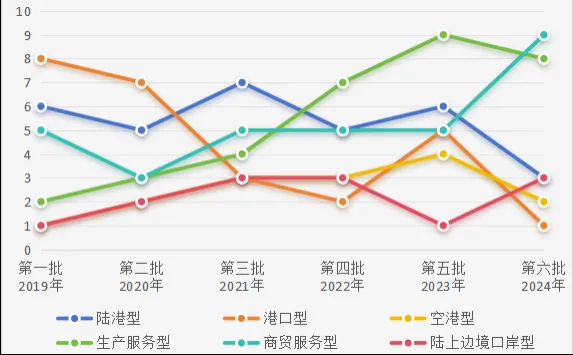 已發(fā)布樞紐的類型結(jié)構(gòu)以陸港型、生產(chǎn)服務(wù)型和商貿(mào)服務(wù)型為主,與規(guī)劃布局大體一致。近三年樞紐建設(shè)類型已逐步向生產(chǎn)服務(wù)型和商貿(mào)服務(wù)型偏移,商貿(mào)服務(wù)型2024年發(fā)布數(shù)量取得爆發(fā)式增長,但總體占比相較規(guī)劃布局仍略有偏差,未來仍屬建設(shè)重點(diǎn)。