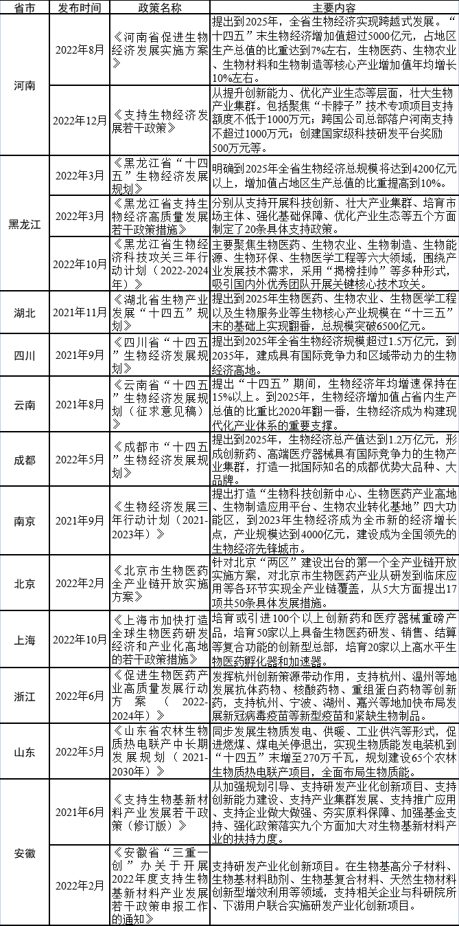 當(dāng)前,發(fā)達(dá)國(guó)家和地區(qū)已將生物經(jīng)濟(jì)視為再工業(yè)化和創(chuàng)造財(cái)富的重要手段和經(jīng)濟(jì)戰(zhàn)略,紛紛在新的發(fā)展戰(zhàn)略中加強(qiáng)對(duì)生物經(jīng)濟(jì)的布局。國(guó)家發(fā)改委于2022年5月發(fā)布《“十四五”生物經(jīng)濟(jì)發(fā)展規(guī)劃》,成為國(guó)家首次把生物經(jīng)濟(jì)作為獨(dú)立經(jīng)濟(jì)形態(tài)進(jìn)行部署的規(guī)劃,標(biāo)志著生物經(jīng)濟(jì)將成為今后一段時(shí)期我國(guó)科技和經(jīng)濟(jì)戰(zhàn)略的重要內(nèi)容,加快發(fā)展生物經(jīng)濟(jì)已成為“十四五”時(shí)期各地?fù)屜炔季值闹攸c(diǎn)。