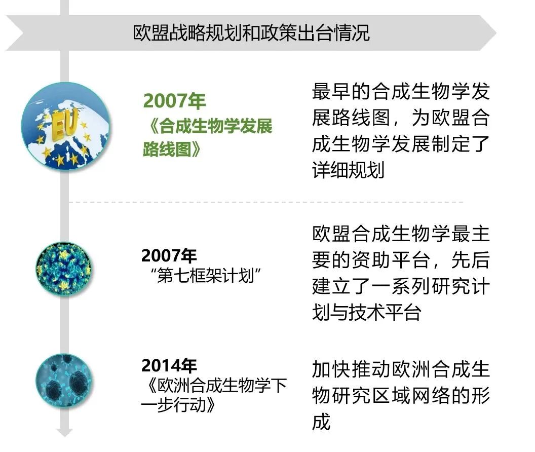 歐盟最早制定了合成生物學(xué)發(fā)展路線圖,并在“第六框架計(jì)劃”(2005年)內(nèi)正式啟動(dòng)合成生物學(xué)研究。為加快促進(jìn)合成生物學(xué)的市場化應(yīng)用,開發(fā)新的生物基產(chǎn)品,建立循環(huán)和可持續(xù)的生物經(jīng)濟(jì),歐盟聚焦生物醫(yī)藥、清潔、食品和環(huán)境保護(hù)等重點(diǎn)領(lǐng)域,陸續(xù)發(fā)布相關(guān)支持計(jì)劃與行動(dòng),支持以合成生物學(xué)來促進(jìn)歐洲向循環(huán)生物經(jīng)濟(jì)轉(zhuǎn)型。