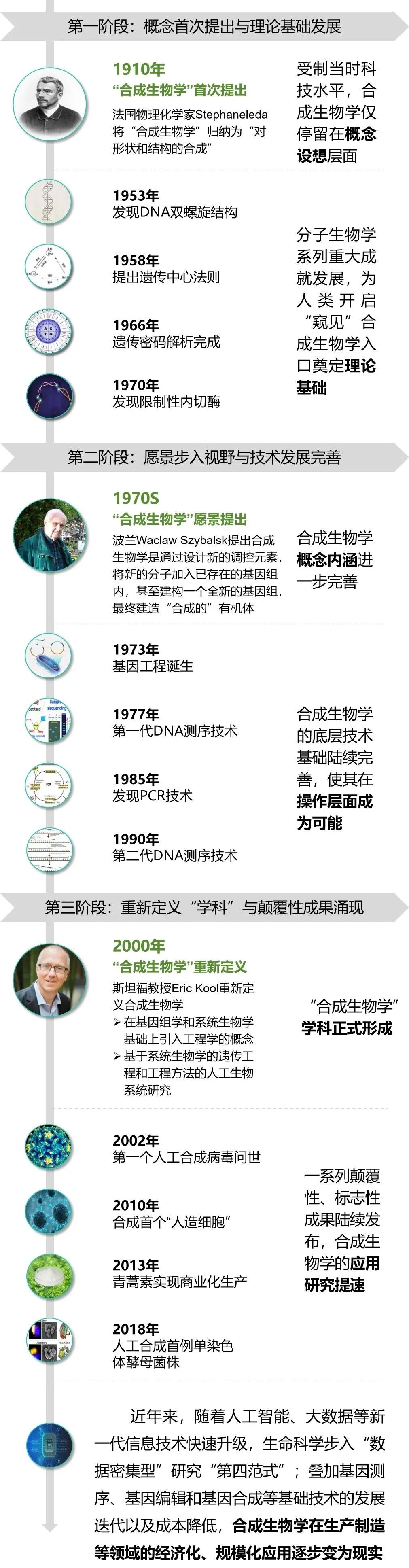 合成生物學(xué)自概念提出到現(xiàn)在發(fā)展歷史已超百年。最早可溯源至19世紀(jì)中葉合成化學(xué)的出現(xiàn)打破無機(jī)物和有機(jī)物的界限,推翻“生命力論”,顛覆了人類對生命體(動物、植物、微生物等)的認(rèn)知。此后,“細(xì)胞學(xué)說”“生物化學(xué)”“遺傳學(xué)說”等相繼提出,人類從細(xì)胞層面、分子層面實(shí)現(xiàn)對生命體認(rèn)識的飛躍,合成生物學(xué)亦隨之演化??傮w看,合成生物學(xué)發(fā)展歷程大致可分為三大階段: