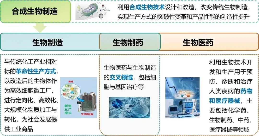 從產(chǎn)業(yè)范疇看,合成生物學(xué)是生物制造最重要的底層技術(shù)之一,生物制造是合成生物技術(shù)的主要應(yīng)用場景。合成生物制造隸屬于生物制造,與生物醫(yī)藥產(chǎn)業(yè)存在交叉重疊的關(guān)系。