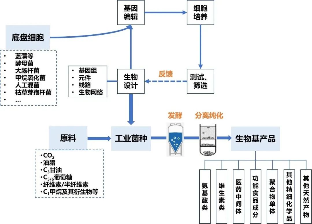 結(jié)合合成生物制造流程來看,其本質(zhì)就是“細(xì)胞工廠”,通過基因技術(shù)編輯底盤細(xì)胞,將生物碳基原料置于底盤細(xì)胞中進(jìn)行發(fā)酵,之后采用多種技術(shù)將發(fā)酵產(chǎn)品從發(fā)酵液或者細(xì)胞中分離、純化出來,在達(dá)到特定標(biāo)準(zhǔn)后制成產(chǎn)品。更通俗地理解,底盤細(xì)胞相當(dāng)于奶牛,各種原料相當(dāng)于低價值的草料,通過改造優(yōu)化過的底盤細(xì)胞,添加低廉原料后經(jīng)過發(fā)酵等一系列工藝產(chǎn)生的高價值的化學(xué)或生物產(chǎn)品。