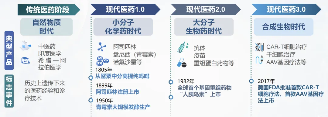 在生命科學(xué)技術(shù)加速演進(jìn)的驅(qū)動下,醫(yī)療健康產(chǎn)業(yè)經(jīng)歷了從傳統(tǒng)到現(xiàn)代、從經(jīng)驗(yàn)到科學(xué)的四個階段的演變過程,當(dāng)前已經(jīng)進(jìn)入現(xiàn)代醫(yī)藥3.0時代。隨著高通量基因測序、CRISPR-Cas基因編輯等技術(shù)的快速更新迭代,合成生物這把探索生命奧秘的新鑰匙,與醫(yī)療健康的融合更加緊密,實(shí)現(xiàn)了從“造物致知”到“造物致用”的進(jìn)階式發(fā)展。