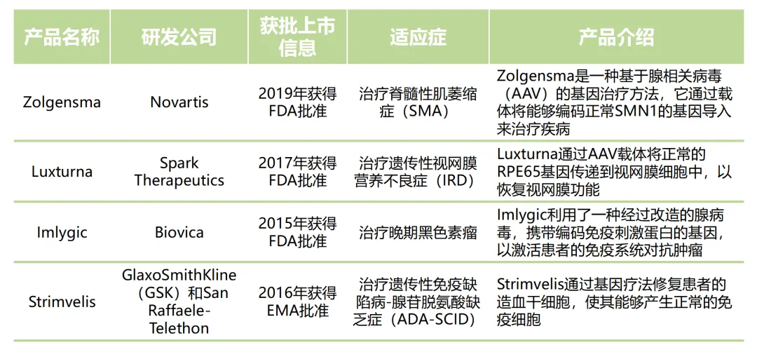 截至目前,合成生物技術(shù)在基因治療領(lǐng)域已有一些產(chǎn)品獲得了國外監(jiān)管機(jī)構(gòu)的批準(zhǔn),進(jìn)入了市場。