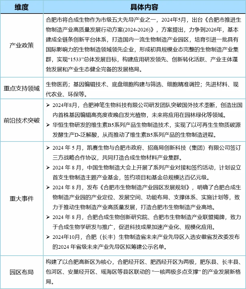 政府為合成生物企業(yè)發(fā)展搭臺。通過與凱賽生物、保利集團等企業(yè)簽訂協(xié)議或基金合作項目,推動科研成果從“實驗室”走向“應用場”,加速推進合成生物制造項目落地。此外,合肥市人民政府聯(lián)合其他單位主辦2024中國生物制造大會,現(xiàn)場開展了系列產業(yè)對接和簽約活動,擬設立首支生物制造主題產業(yè)基金,計劃簽約項目和基金總規(guī)模達百億元級。作為首屆中國生物制造大會,體現(xiàn)出合肥市在發(fā)展生物制造產業(yè)領域的決心與魄力。