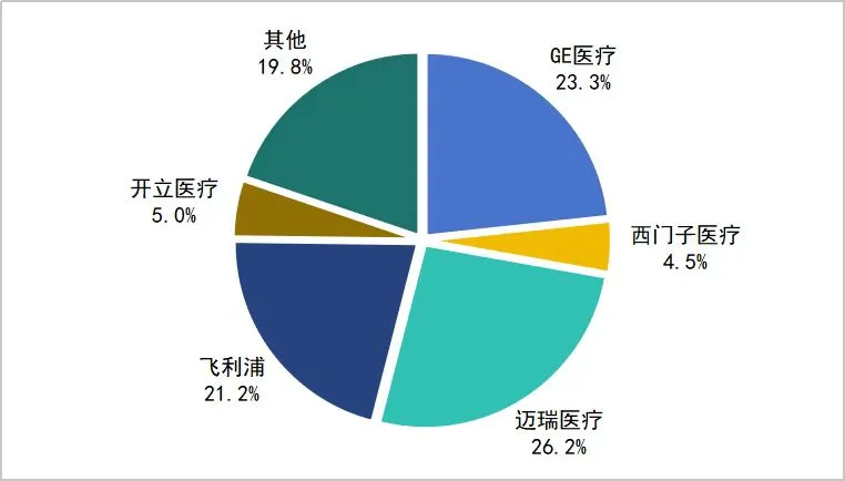 我國US市場規(guī)模約180億元,GE醫(yī)療(26%)、邁瑞醫(yī)療(24%)、飛利浦(24%)三家企業(yè)合計占據(jù)市場75%以上份額。隨著設備更新落地,國產(chǎn)品牌市場份額占比明顯提升,截至2024年三季度,US國產(chǎn)品牌占比提升至41%(邁瑞醫(yī)療26%、開立醫(yī)療5%,其他10%),GE醫(yī)療、飛利浦分別下降至23%、21%,預計2024年第四季度以及2025年上半年,隨著邁瑞醫(yī)療、開立醫(yī)療等企業(yè)參與更多設備更新采購,國產(chǎn)品牌市場份額將進一步快速提升。