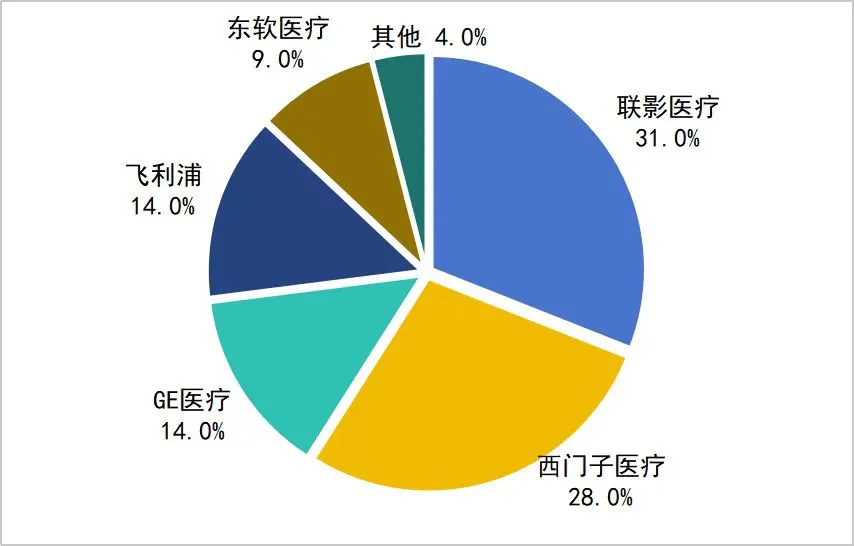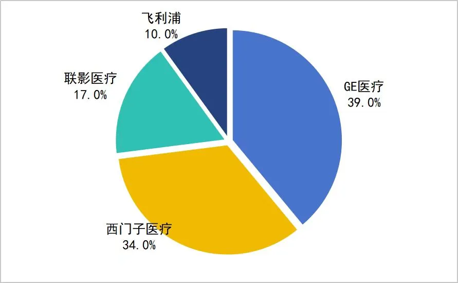 MR主要包括MR(1.5T)和MR(3.0T)兩種。其中,MR(3.0T)以其更高的信噪比、空間分辨率和掃描速度,極大提升了診斷精度,臨床應用日益廣泛,占據(jù)MR總體市場超52%的市場份額,且市場份額高度集中,GE醫(yī)療(39%)、西門子醫(yī)療(34%)、聯(lián)影醫(yī)療(17%)三家企業(yè)合計市占率近90%。聯(lián)影醫(yī)療、東軟醫(yī)療加速入局本次醫(yī)療設備更新,提升MR國產(chǎn)化率,其中東軟醫(yī)療以1.5T產(chǎn)品為主,聯(lián)影醫(yī)療在主導1.5T市場份額的基礎上強勢進軍3.0T市場。