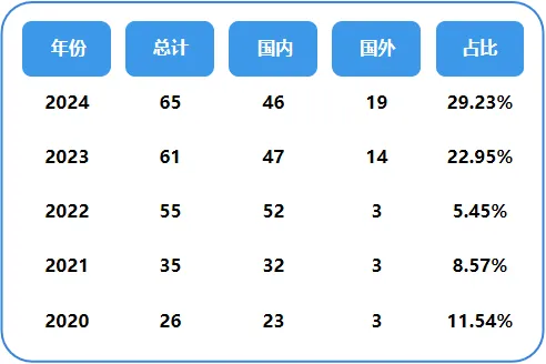 2024年共65款創(chuàng)新醫(yī)療器械產(chǎn)品上市(詳表附后),同比增長(zhǎng)6.6%,獲批數(shù)量為2014年以來的歷史新高。從數(shù)量上看,美國(guó)直覺外科公司獲批產(chǎn)品數(shù)量最多,系歷年首次有國(guó)外企業(yè)獲此“殊榮”,其共獲批5款產(chǎn)品,均為支氣管導(dǎo)航操作系統(tǒng)部件。其次為北京品馳醫(yī)療,共有4款產(chǎn)品獲批,包括植入式腦深部電刺激電極導(dǎo)線套件等創(chuàng)新產(chǎn)品。
