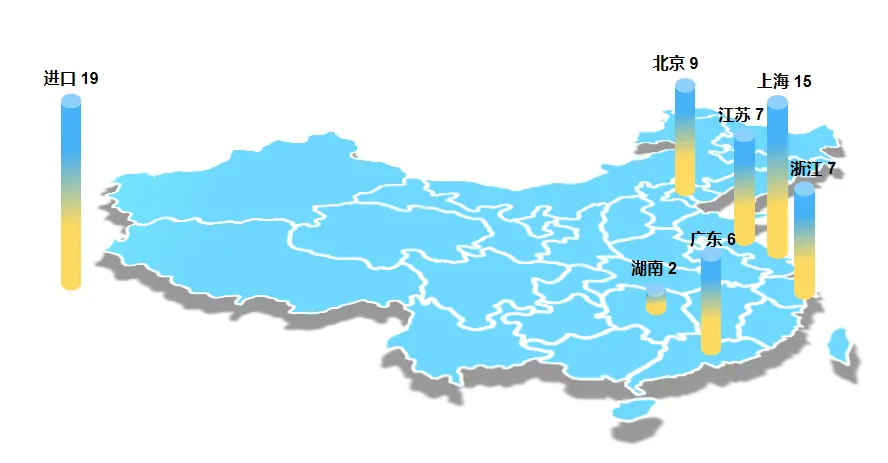 65款獲批產(chǎn)品中,本土46款(占71%)、進(jìn)口19款(占29%),進(jìn)口產(chǎn)品的比例首次升近三成,可見隨著我國(guó)創(chuàng)新醫(yī)療器械審批制度不斷與國(guó)際接軌,創(chuàng)新醫(yī)療器械市場(chǎng)日益融入全球。本土品種上,上海共獲批15款創(chuàng)新醫(yī)療器械,位居全國(guó)第一,領(lǐng)先北京9款,兩地獲批產(chǎn)品數(shù)量合計(jì)占比從2023年的33%攀升至2024年37%。進(jìn)口品種上,美國(guó)國(guó)際引領(lǐng)地位更加突出,獲批數(shù)量(17個(gè))占比近9成,遠(yuǎn)高于2023年的6成;另有德國(guó)、日本各1個(gè)獲批在國(guó)內(nèi)上市。