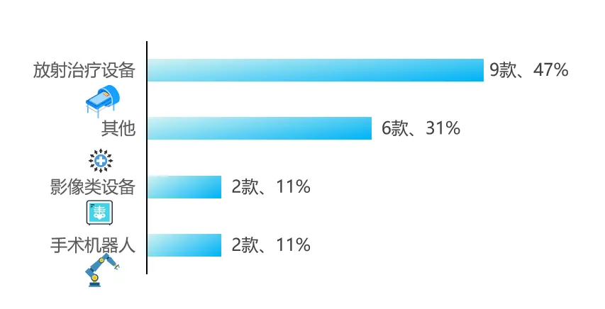 高端醫(yī)療裝備創(chuàng)新產(chǎn)品獲批共19款,放射性治療設(shè)備較去年增加,其中微創(chuàng)消融類裝備實(shí)現(xiàn)翻倍增加(從3增加到6),幫助腫瘤治療手術(shù)有效減輕患者痛苦并提升疾病治愈率。