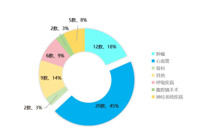 心血管位列第一,共29款產(chǎn)品,占比45%,腫瘤緊隨其后,12款產(chǎn)品,占比18%。這一數(shù)據(jù)與《中國(guó)心血管病報(bào)告2023》中提到的“中國(guó)心血管病死亡率居疾病死亡構(gòu)成的首位,高于腫瘤及其他疾病”成鮮明的對(duì)應(yīng)關(guān)系,反映出心血管疾病和腫瘤疾病在我國(guó)疾病防治中的重要性和緊迫性。