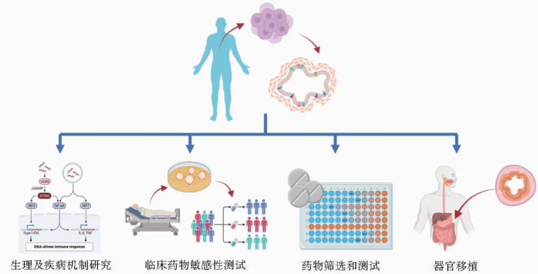 類器官模型為遺傳性疾病、感染性疾病、腫瘤治療等提供“可視化”且可大規(guī)模培養(yǎng)的實(shí)驗(yàn)平臺(tái),器官芯片可以進(jìn)一步連接多個(gè)器官模塊,模擬器官間的信號(hào)傳遞和轉(zhuǎn)移機(jī)制,識(shí)別潛在的疾病治療靶點(diǎn),推動(dòng)疾病機(jī)制基礎(chǔ)研究向臨床轉(zhuǎn)化。現(xiàn)階段,已實(shí)現(xiàn)腦、肝、肺、胰腺、胃腸道等多器官正常或病變類器官的模擬構(gòu)建。