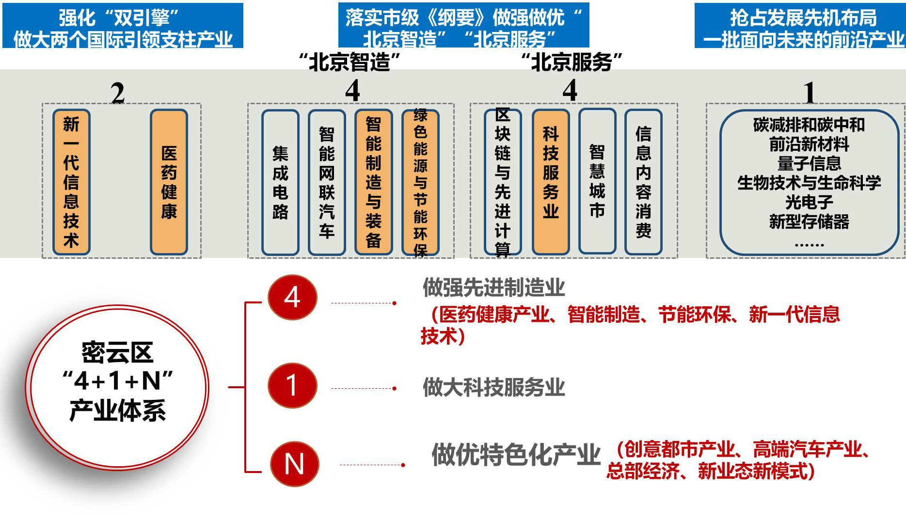 規(guī)劃梳理總結(jié)密云區(qū)高精尖產(chǎn)業(yè)現(xiàn)狀和形勢(shì),根據(jù)市委對(duì)生態(tài)涵養(yǎng)區(qū)“不斷擴(kuò)大生態(tài)環(huán)境容量和提高生態(tài)環(huán)境質(zhì)量”的新要求,提出堅(jiān)持科技創(chuàng)新、生態(tài)融合兩條主線(xiàn),加快推進(jìn)創(chuàng)意都市、汽車(chē)零部件等傳統(tǒng)產(chǎn)業(yè)轉(zhuǎn)型升級(jí),以醫(yī)藥健康、智能制造、節(jié)能環(huán)保、新一代信息技術(shù)產(chǎn)業(yè)為主導(dǎo),以科技服務(wù)業(yè)為支撐,以新業(yè)態(tài)、新模式為補(bǔ)充,構(gòu)建“4+1+N”的高精尖產(chǎn)業(yè)體系和“3+5+4”的高精尖產(chǎn)業(yè)空間體系,推動(dòng)密云綠色創(chuàng)新發(fā)展示范區(qū)建設(shè)。