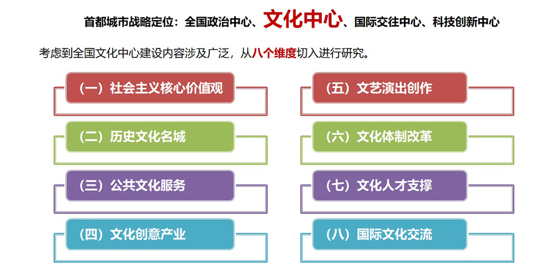 落實(shí)北京市“四個(gè)中心”城市戰(zhàn)略定位,從全國文化中心的內(nèi)涵和要求出發(fā),聚焦“古都文化、紅色文化、京味文化和創(chuàng)新文化”,明晰全國文化中心建設(shè)思路,提出發(fā)展目標(biāo),部署重點(diǎn)任務(wù)