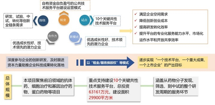 圍繞研發(fā)、試驗(yàn)、中試、轉(zhuǎn)化等創(chuàng)新全鏈條需求,通過“活機(jī)制、強(qiáng)支持、促協(xié)同”的支持手段,建設(shè)生命科學(xué)園關(guān)鍵共性技術(shù)服務(wù)平臺(tái),采用園區(qū)提供場(chǎng)地并主導(dǎo)投資建設(shè)、合作企業(yè)租用運(yùn)營(yíng)的模式進(jìn)行推進(jìn),探索以“租金/服務(wù)換股權(quán)”等模式,深度參與企業(yè)的創(chuàng)新研發(fā),及時(shí)跟進(jìn)資本力量助推企業(yè)科技成果轉(zhuǎn)化落地,逐步實(shí)現(xiàn)“一個(gè)技術(shù)平臺(tái)、一個(gè)重大成果、一個(gè)上市企業(yè)”的產(chǎn)出目標(biāo),實(shí)現(xiàn)園區(qū)平臺(tái)與入駐企業(yè)共享共創(chuàng)共贏的發(fā)展模式,助力北京建設(shè)國(guó)際科技創(chuàng)新中心和成為擁有國(guó)際影響力的生物醫(yī)藥自主創(chuàng)新主陣地。
